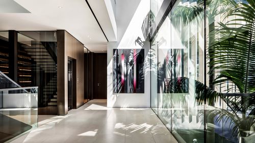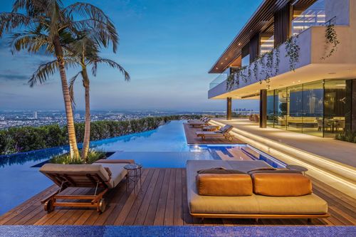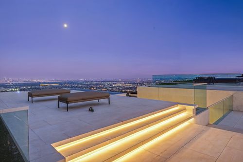 • Floor-to-ceiling glass walls frame unobstructed views of the Los Angeles skyline and Pacific Ocean, allowing natural light to flood the interiors.